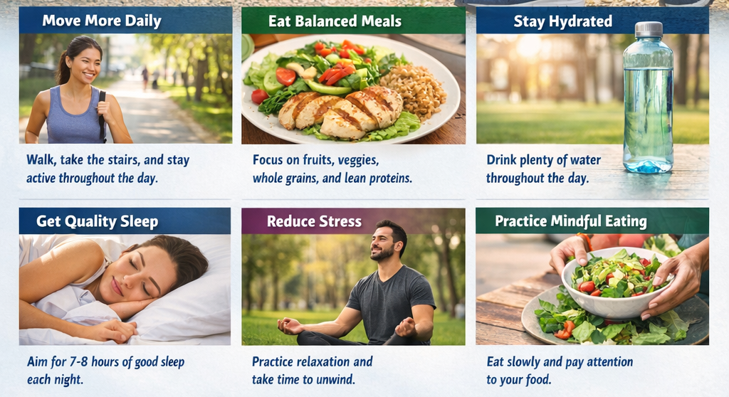 Simple lifestyle changes for better fitness include daily movement, eating balanced meals, staying hydrated, getting enough sleep, managing stress, and maintaining consistency. These small habits improve overall health without requiring intense workouts or gym memberships.